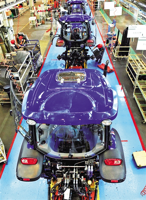 这是位于山东潍坊雷沃重工阿波斯拖拉机总装车间的生产线。据介绍,雷沃重工股份有限公司是我国农业装备制造企业,其产品已经销售全球120多个国家和地区。