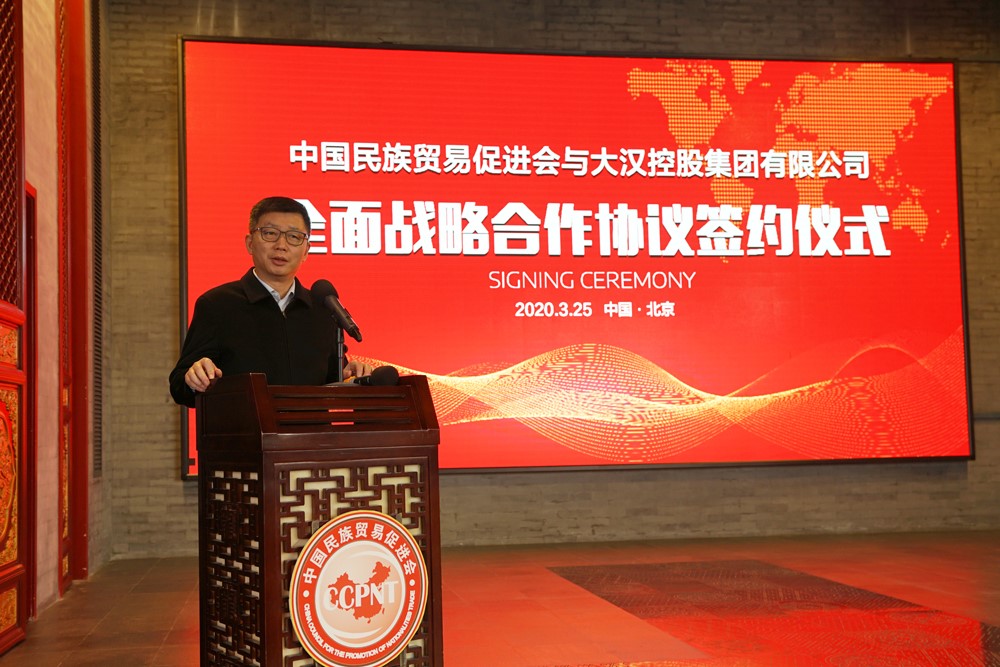 大汉集团是一个走着红色文化基因的企业,始终不忘初心,牢记使命,坚持“资本=责任、业绩=财富”的 企业核心价值观,面对考验,大汉集团步履坚定,自信从容。大汉集团董事长傅胜龙在致辞中表示,大汉集团作为植根湖湘大地的一家跨地区、跨行业的大型综合性企业集团。成立28年来,大汉集团实现了从传统企业向产业互联网企业的成功转型,形成了有品牌、有产业的新大汉发展模式。此次与中国民贸的交流与合作,深深感受到中国民贸处事的高度、业务的广度、工作的力度、独特的角度。中国民贸作为全国性一级社会组织,始终服务于民族地区经济社会发展和民族团结进步事业,这种初心与大汉集团文化不谋而合,都希望能切实为国家发展、民族复兴贡献绵薄之力。双方有了缘分,因缘分有了共同的使命。相信通过双方的共同努力,能够在短期内为长沙的蜕变、冲刺超大城市的目标,产生巨大作用。希望双方带着这份共同的梦想和使命,创造伟大事业。我们将充分利用自身优势,积极融入中国一乡一品产业促进计划中,把握高度、拓宽广度、加强力度、 多元角度与中国民贸一道,为发展民族特色产业、打造民族自主品牌、扩大民族地区交流合作等做出自己应有的贡献。