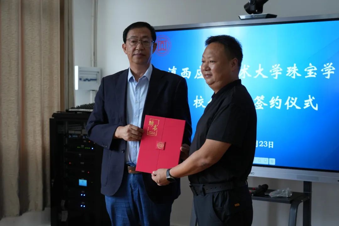 ▲李志承院长代表珠宝学院为李佩红院长(亓季松副书记代)、白学宾教授、王孟堂董事长颁发聘书