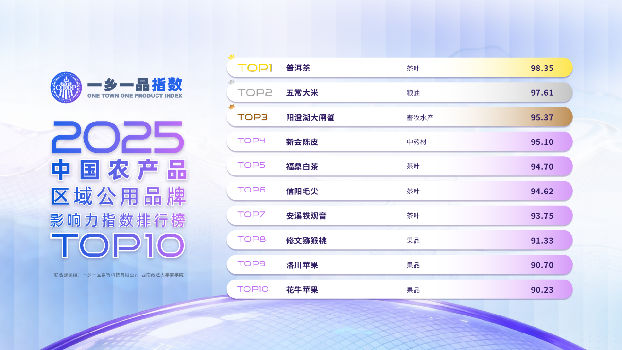 “2025中国农产品区域公用品牌影响力指数TOP100”榜单如下: