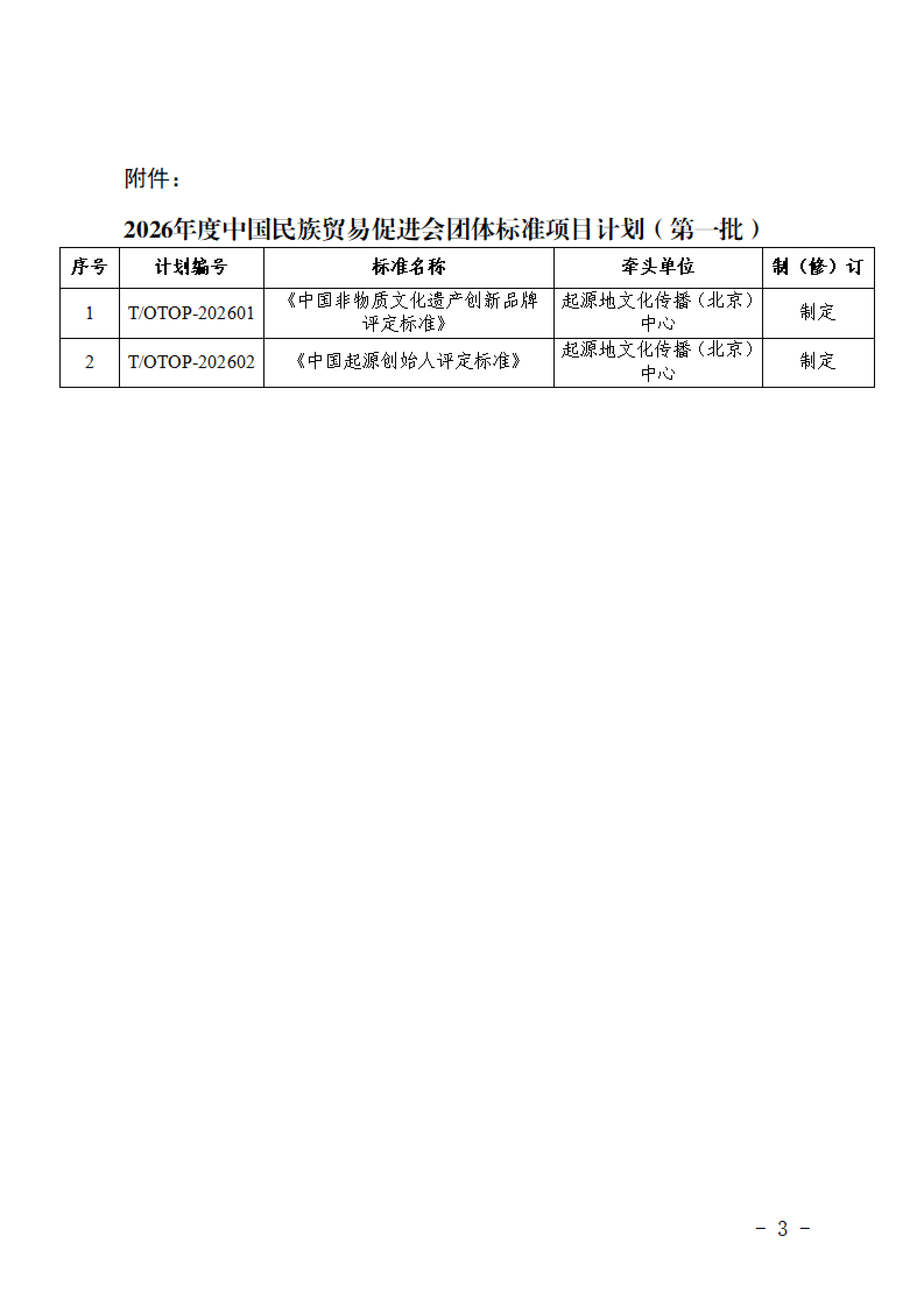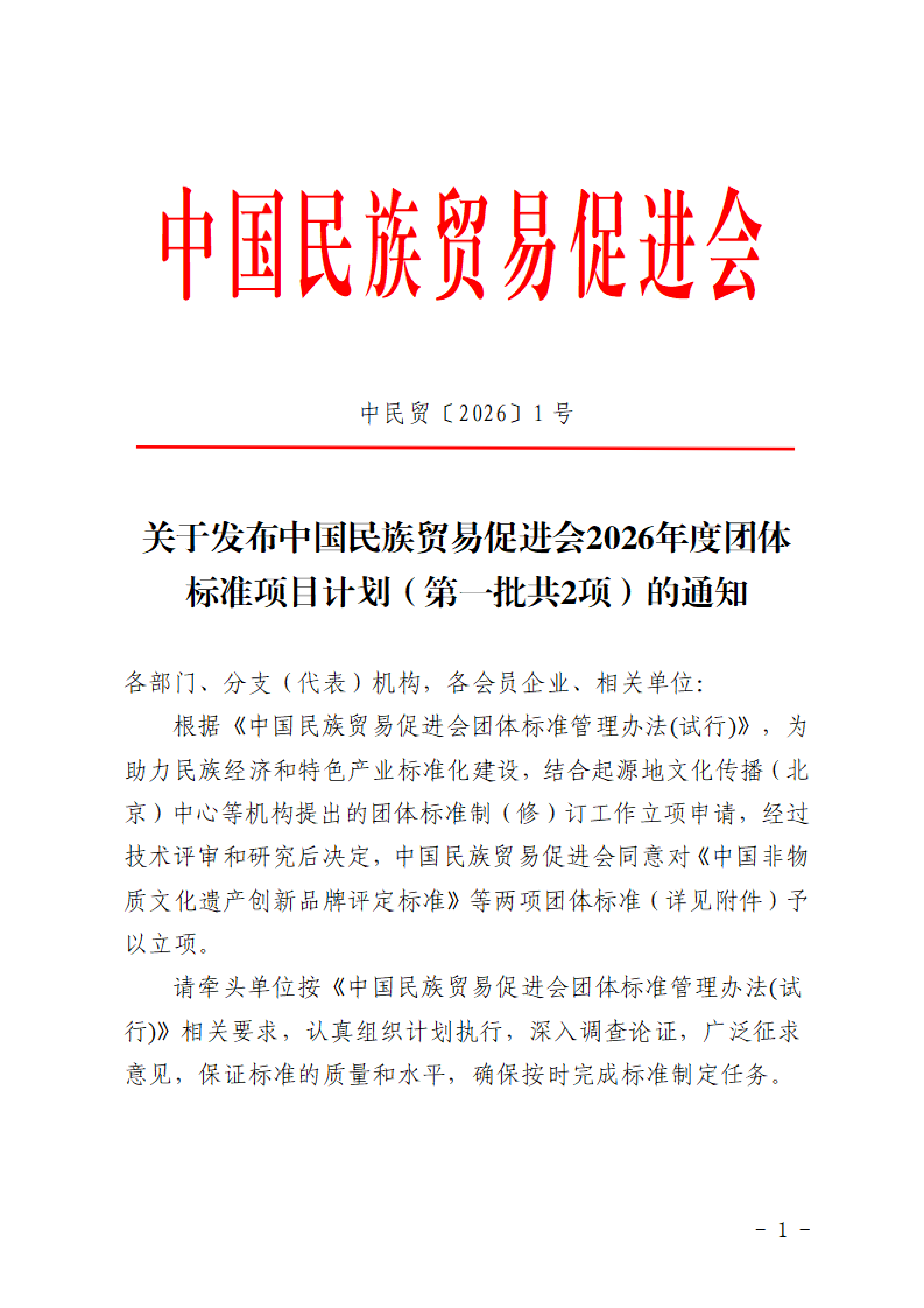 关于发布中国民族贸易促进会2026年度团体标准项目计划(第一批共2项)的通知