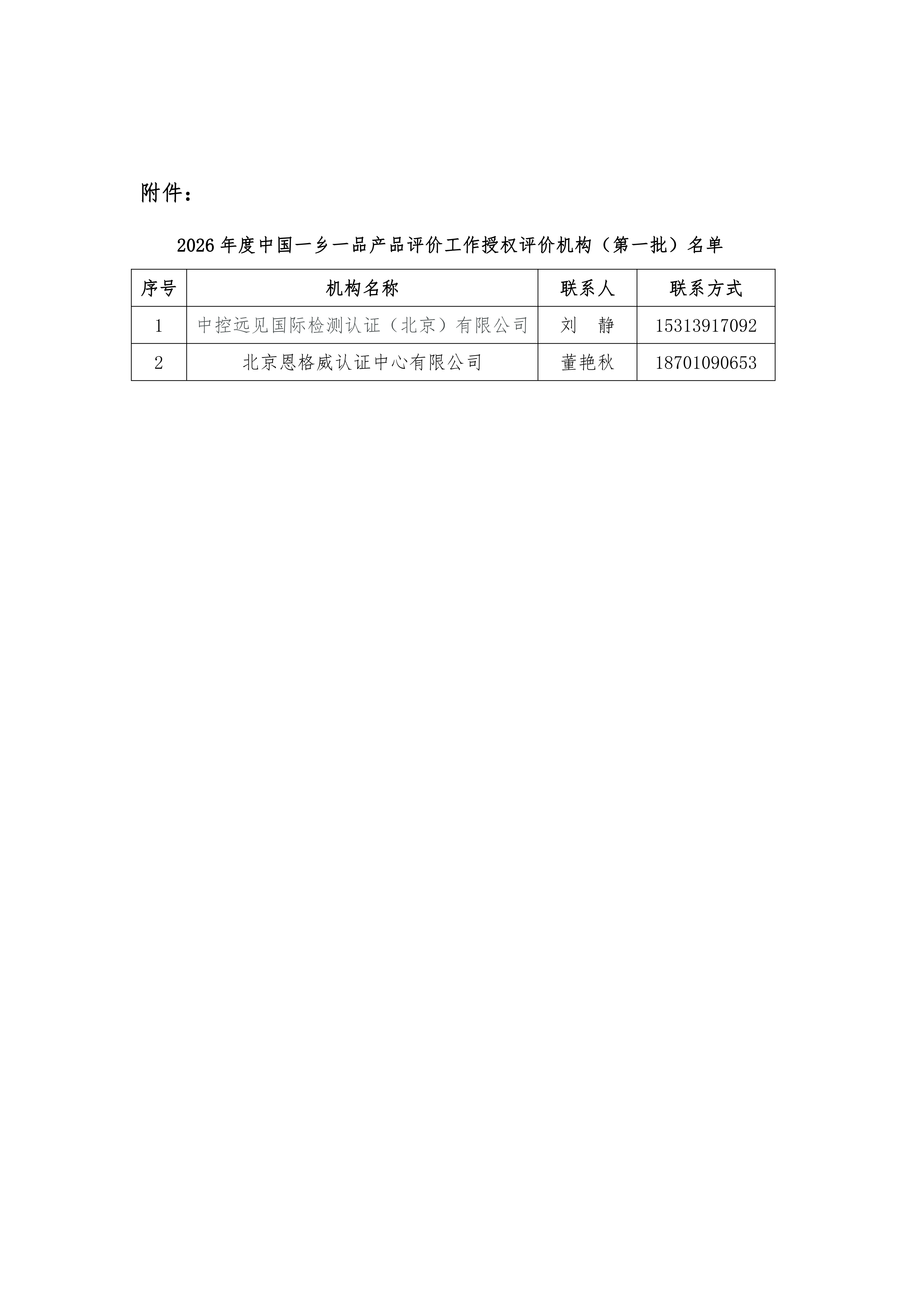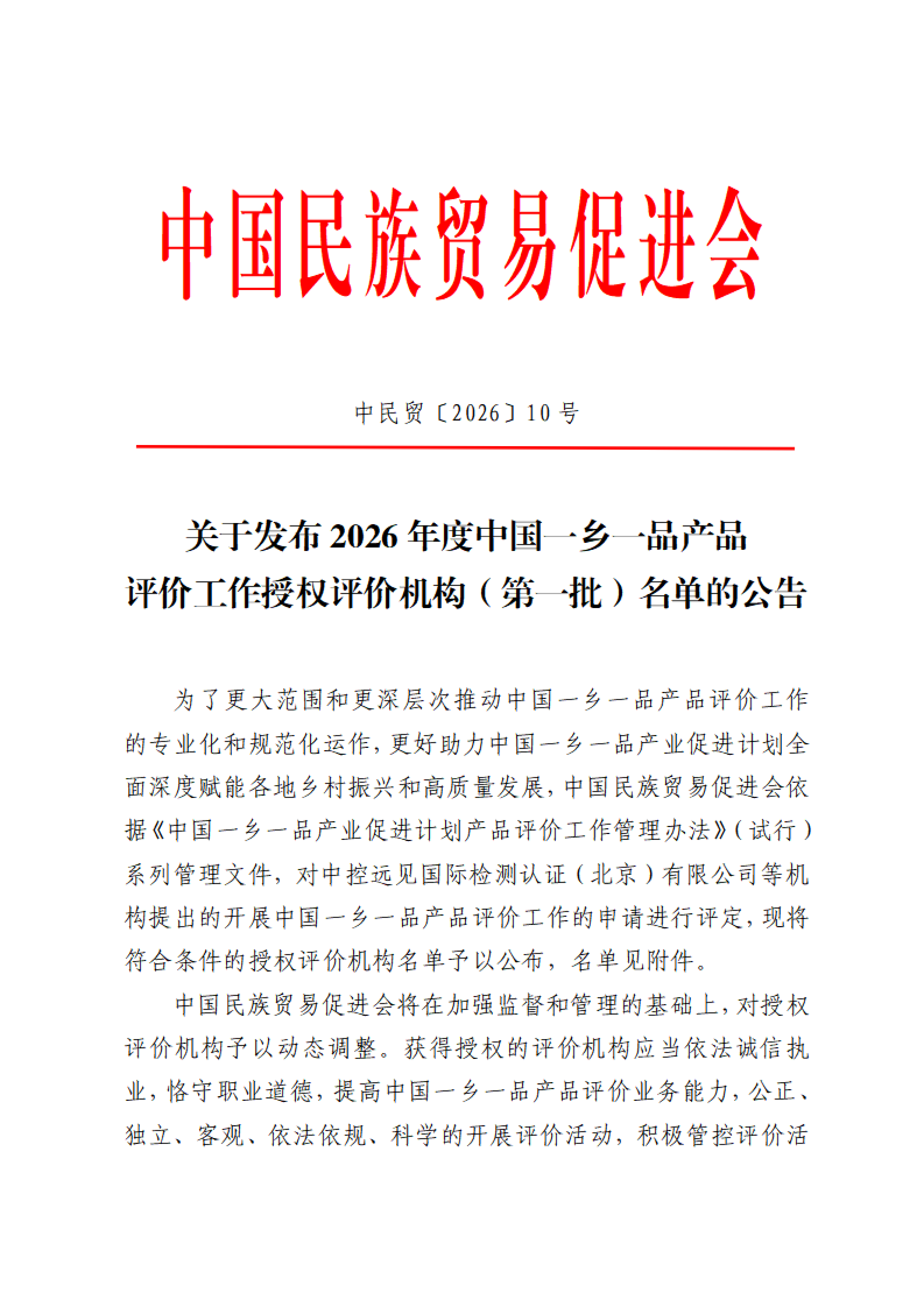 关于发布2026年度中国一乡一品产品评价工作授权评价机构(第一批)名单的公告