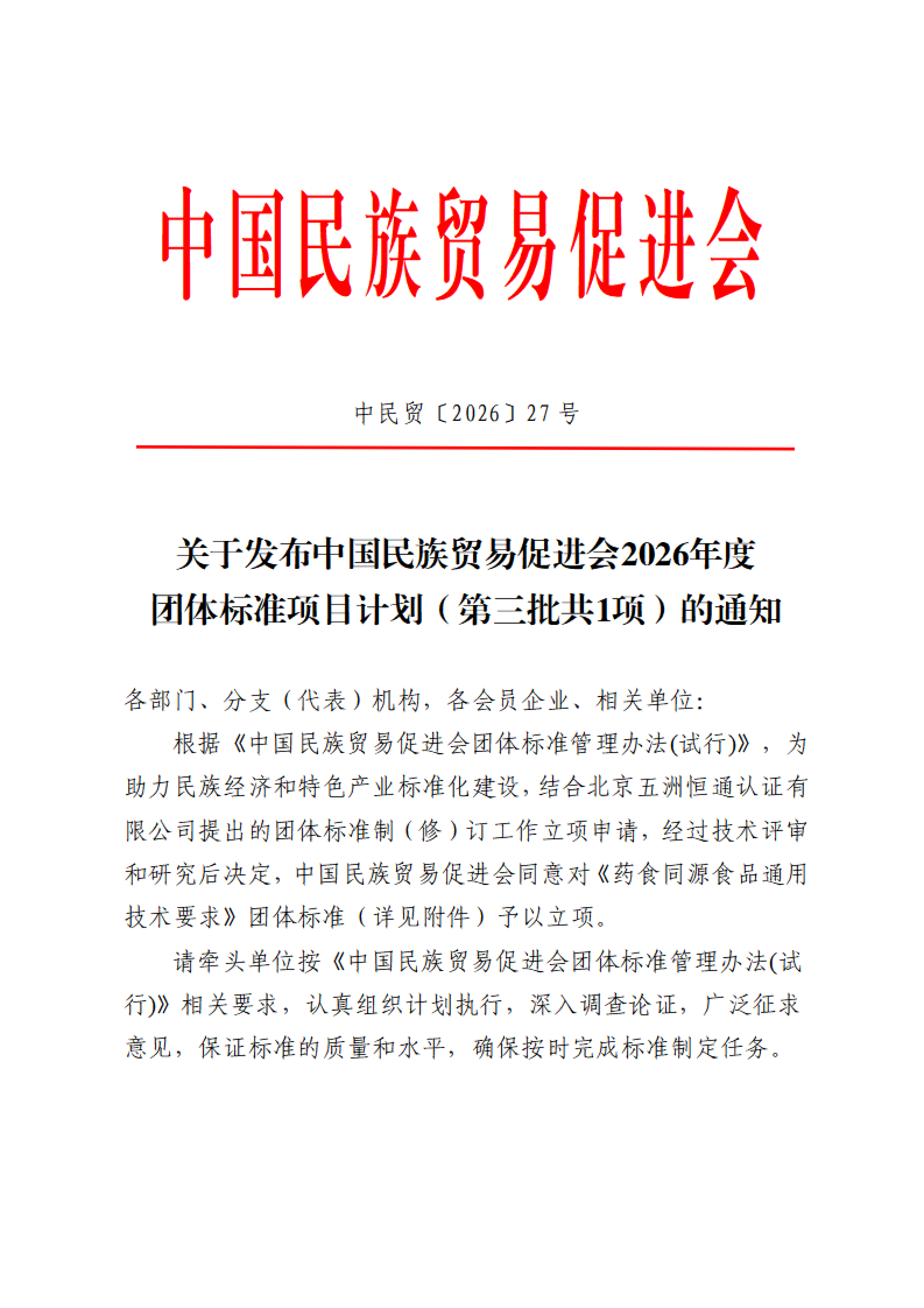 关于发布中国民族贸易促进会2026年度团体标准项目计划(第三批共1项)的通知