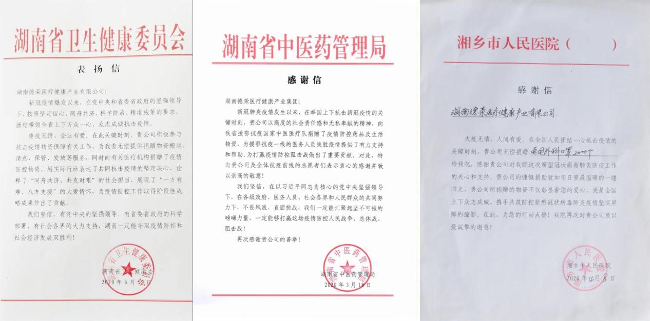 自抗疫行动以来,德荣医疗从全球紧急采购并供应口罩120万支、各类防护服50.7万件、防护手套31.4万副、防护帽7.2万个、消毒液和酒精8.2万瓶、鞋套20.4万双、双氧水30吨,医疗设备1665台。配合湖南省卫健委、工信厅、湖南各地市疾控中心等46家单位紧急配送防疫物资,重点供应医院155家,包括湘雅医院、湘雅附二、湘雅附三、省人民医院等。