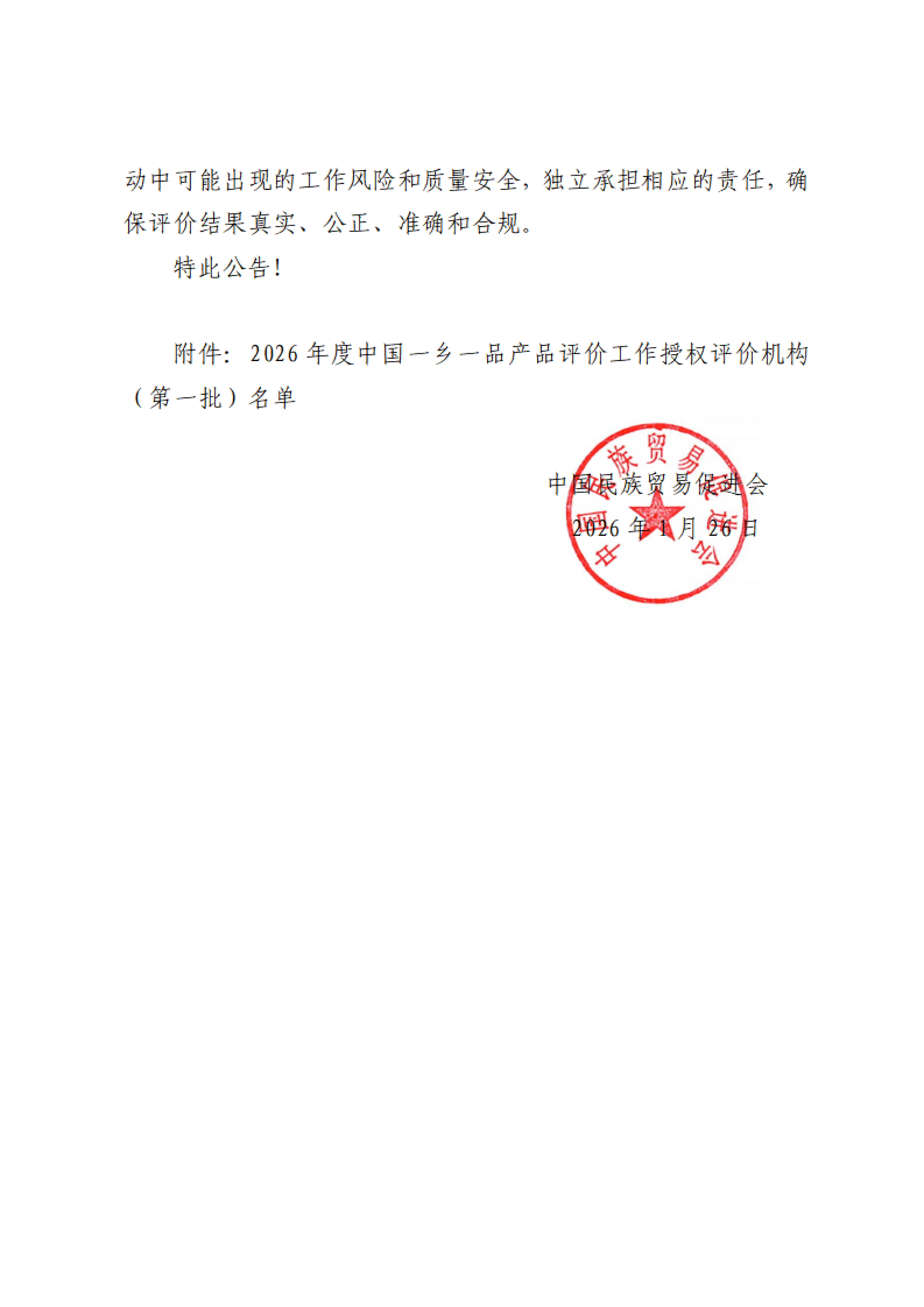 关于发布2026年度中国一乡一品产品评价工作授权评价机构(第一批)名单的公告