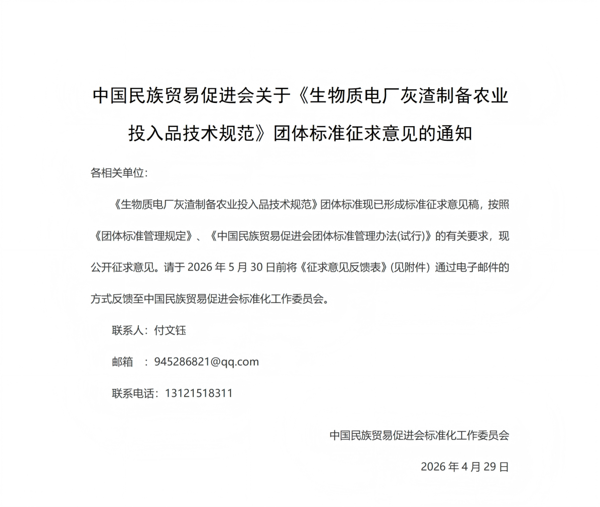 中国民族贸易促进会关于《生物质电厂灰渣制备农业投入品技术规范》团体标准征求意见的通知